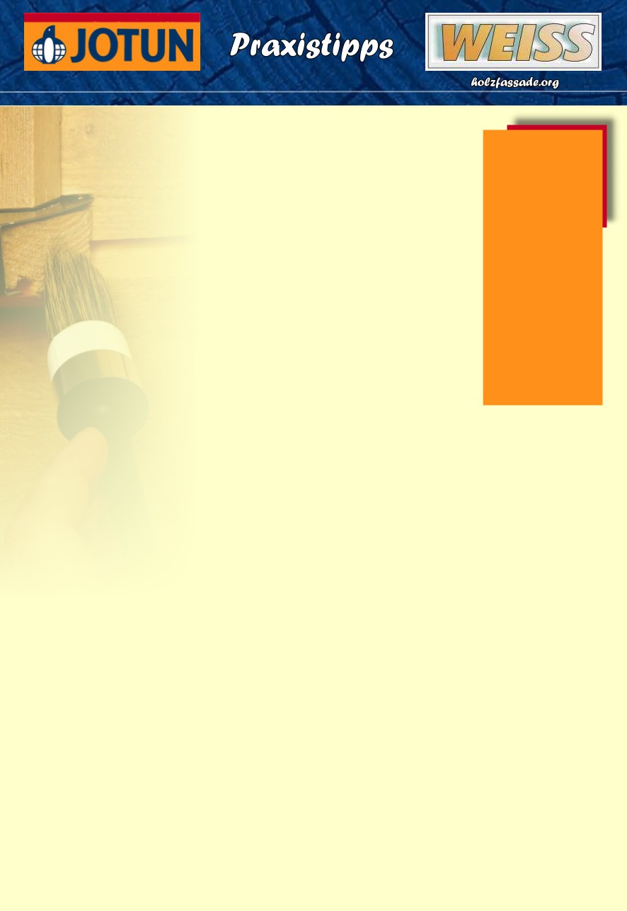 UntergrundvorbehandlungNeues Holz: Hier ist keine Vorbehandlung notwendig. Jedoch muss berücksichtigt werden, dass unter neuem Holz auch wirklich neues, unbewittertes Holz zu verstehen ist. War das Holz bereits der Bewitterung ausgesetzt, findet schon nach kurzer Zeit ein Ligninabbau statt. Das Holz ist nicht mehr zu 100 % tragfähig und die Anhaftung von Anstrichen wird nachteilig beeinflusst. Eventuelle Verschmutzungen müssen mit Schleifpapier der Körnung P80-P120 entfernt , die holzflächen entstaubt und das saubere, trockene Holz allseitig mit Hirnholzflächen haben ein bis zu 200-fach höheres Saugvermögen als die Fläche und sollten daher stets satt bis zur Sättigung bearbeitet werden. Eine umgehende Grundierung ist von großer Bedeutung, da bereits nach wenigen Tagen der Abwitterungsprozeß des Holzes durch die UV - und Feuchtigkeitsbelastung beginnt.